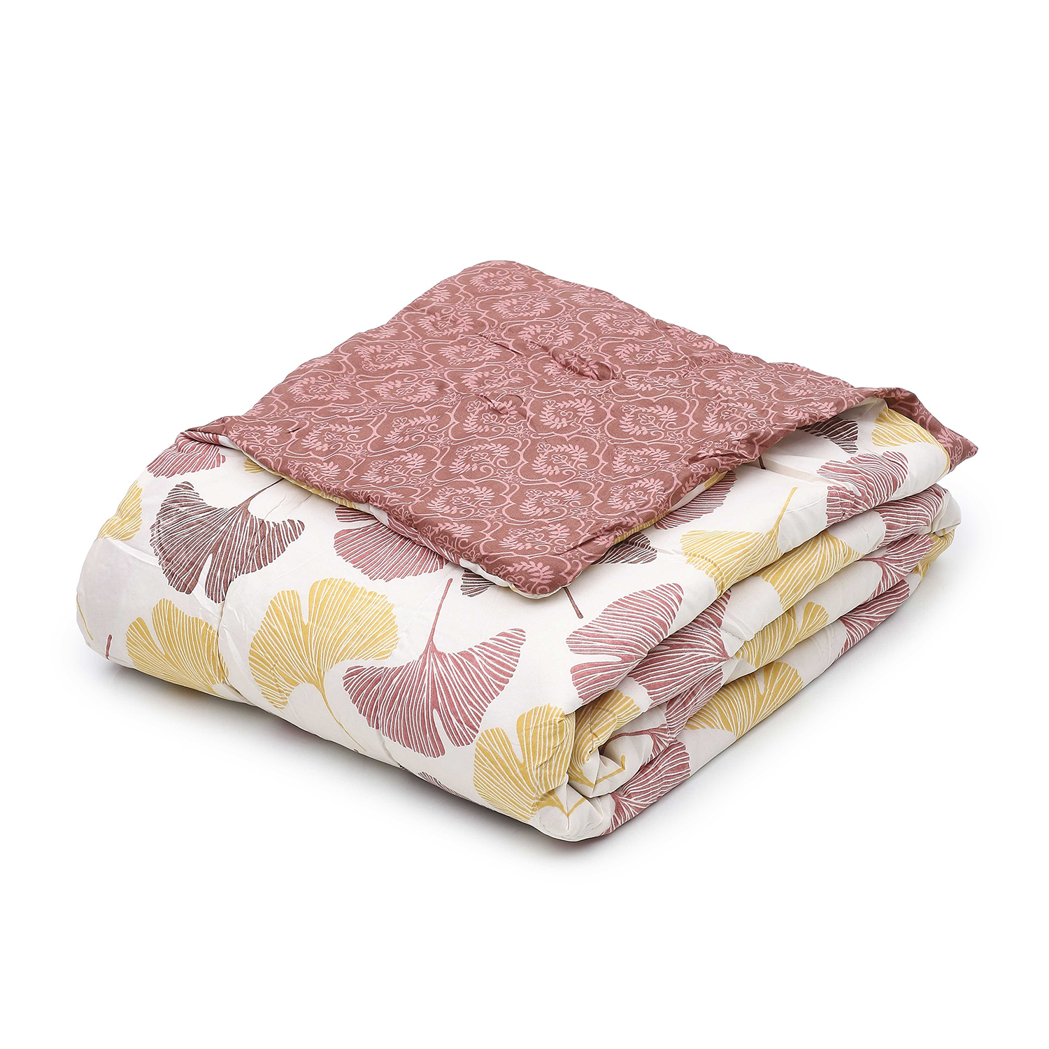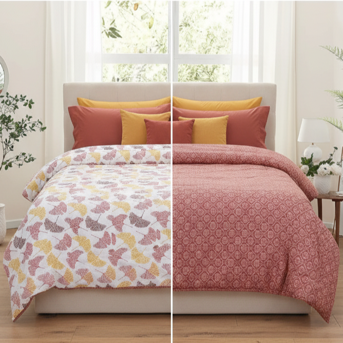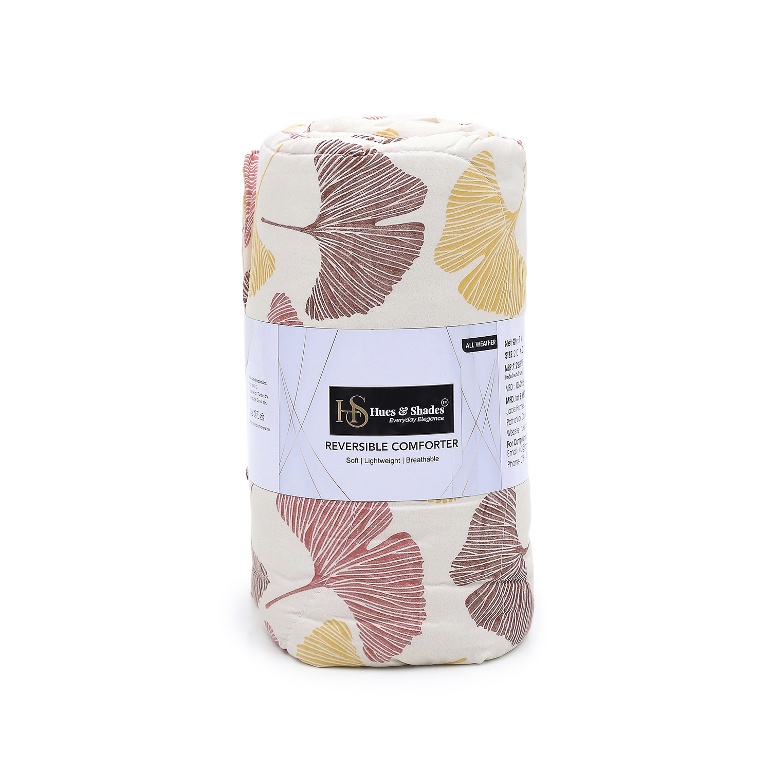 Experience the luxurious comfort of the HUES & SHADES Microfibre Reversible Comforter (Golden Leaf), designed to wrap you in softness while remaining light and breathable for year-round use. This double bed comforter (200 x 215 cm) features a 100% microfiber shell with a smooth, silky hand-feel that resists pilling and maintains color vibrancy after repeated washes. The ultra-light polyester filling delivers gentle warmth without bulk, making it ideal for air-conditioned bedrooms, mild winters, and layered bedding setups. Thoughtful machine stitching keeps the fill evenly distributed to prevent lumps and extend the life of the comforter so it retains a plush hotel-style appearance. Reversible by design, Rosewood Charm gives you two coordinated looks in one?flip sides to update decor without buying multiple comforters. Caring for this comforter is simple: machine wash on a gentle cycle, tumble dry low, and fluff to restore loft. Packaged compressed for efficient shipping, simply air out to regain full volume. Whether you?re refreshing your master bedroom, outfitting a guest room, or gifting someone a cozy sleep upgrade, this comforter offers a premium look, effortless care, and lasting performance. HUES & SHADES offers responsive customer support for sizing or care questions ? we want you to sleep better, every night.