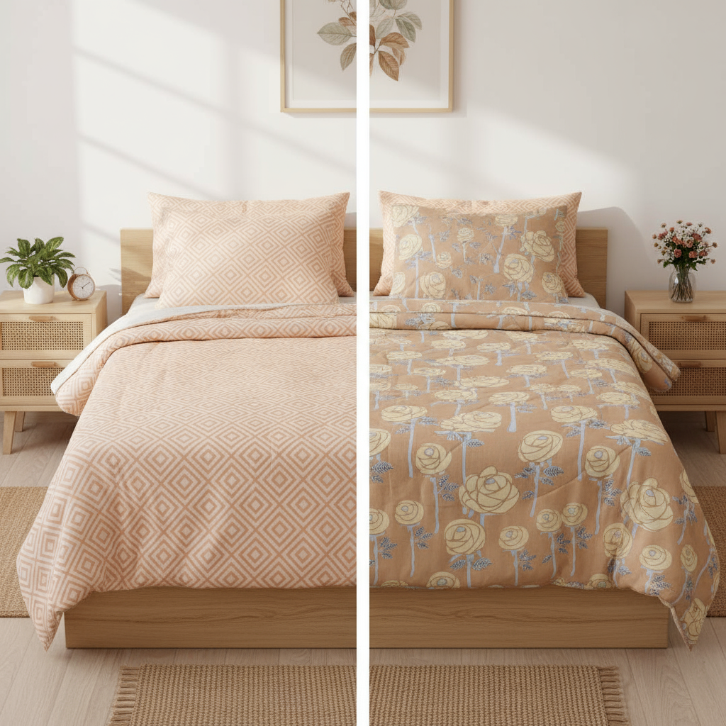 Experience the luxurious comfort of the HUES & SHADES Microfibre Reversible Comforter (Rosewood Charm), designed to wrap you in softness while remaining light and breathable for year-round use. This double bed comforter (200 x 215 cm) features a 100% microfiber shell with a smooth, silky hand-feel that resists pilling and maintains color vibrancy after repeated washes. The ultra-light polyester filling delivers gentle warmth without bulk, making it ideal for air-conditioned bedrooms, mild winters, and layered bedding setups. Thoughtful machine stitching keeps the fill evenly distributed to prevent lumps and extend the life of the comforter so it retains a plush hotel-style appearance. Reversible by design, Rosewood Charm gives you two coordinated looks in one?flip sides to update decor without buying multiple comforters. Caring for this comforter is simple: machine wash on a gentle cycle, tumble dry low, and fluff to restore loft. Packaged compressed for efficient shipping, simply air out to regain full volume. Whether you?re refreshing your master bedroom, outfitting a guest room, or gifting someone a cozy sleep upgrade, this comforter offers a premium look, effortless care, and lasting performance. HUES & SHADES offers responsive customer support for sizing or care questions ? we want you to sleep better, every night.